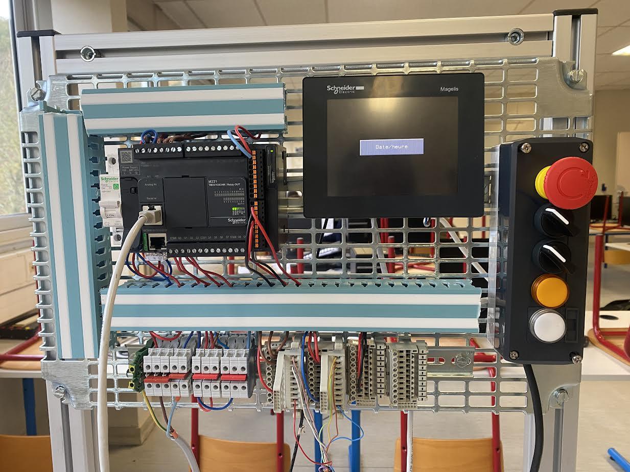 Tout d'abord, j'ai câblé une platine avec un automate, un écran, des borniers, des boutons et des voyants